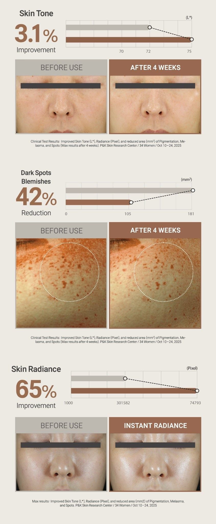Sự kết hợp của các thành phần có nguồn gốc tự nhiên giúp ức chế quá trình hình thành melanin, cải thiện sắc da, mang lại làn da sáng trong, đều màu và rạng rỡ tự nhiên.